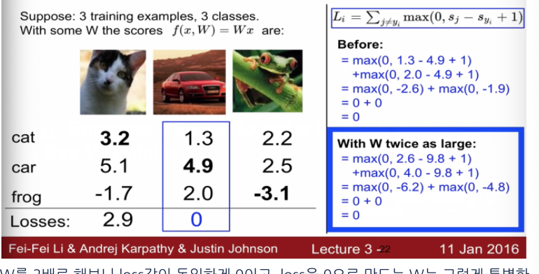 W를 2배로 해보니 loss값이 동일하게 0이고, loss을 0으로 만드는 W는 그렇게 특별한 존재가 아니다