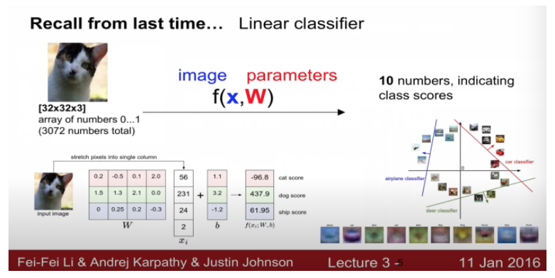 Linear Classifer 해석은 두 가지 가 있다. 1. 템플릿들을 매치해 가는 과정, 매칭 템플릿 2. 고차원 공간에 있는 이미지들 사이에서 클래스 스코어 기반해서 구분해내는 과정을 생각해볼 수 있다.
