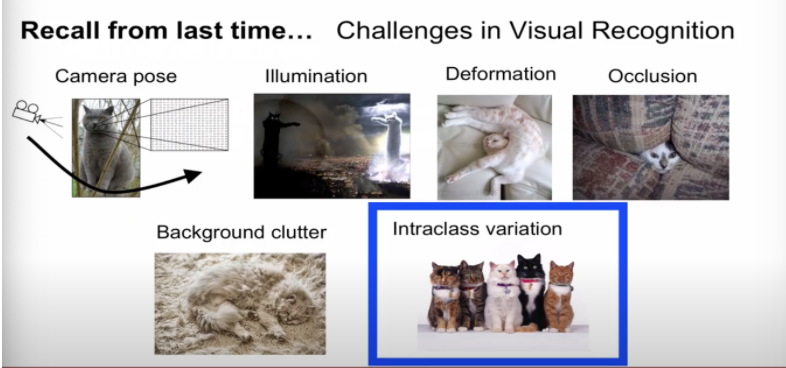 - 컴퓨터가 이미지 인식에는 카메라가 어떤 각도에 있냐, 조면, 변형, 은폐/은닉, 배경과의 구별 모호, 클래스 내의 variation의 장애물이 있다.